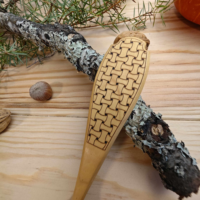 Le kolrosing est une technique de gravure qui consiste à pratiquer de fines incisions dans le bois pour former des motifs fins et régulier. Ensuite, on frotte une poudre sombre comme du café ou de la cannelle, dans les incisions, pour créer le dessin.